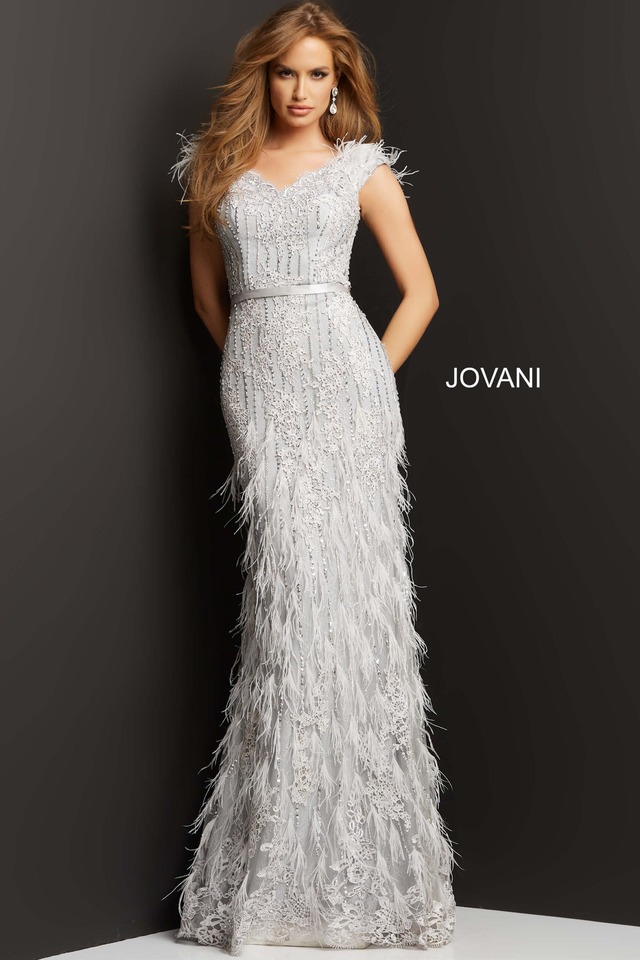 【JOVANI】03108 Silver Feather Embellished Dress