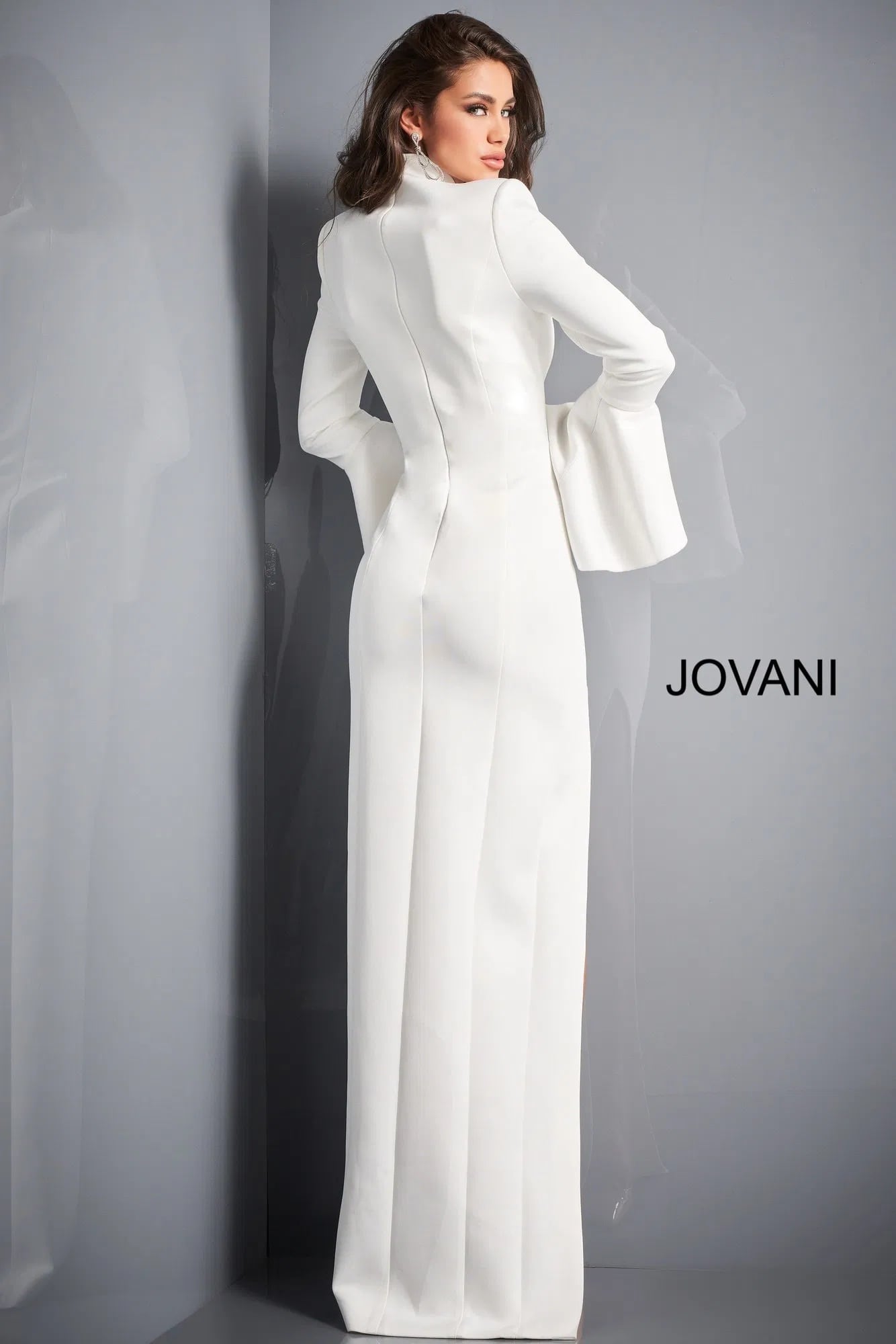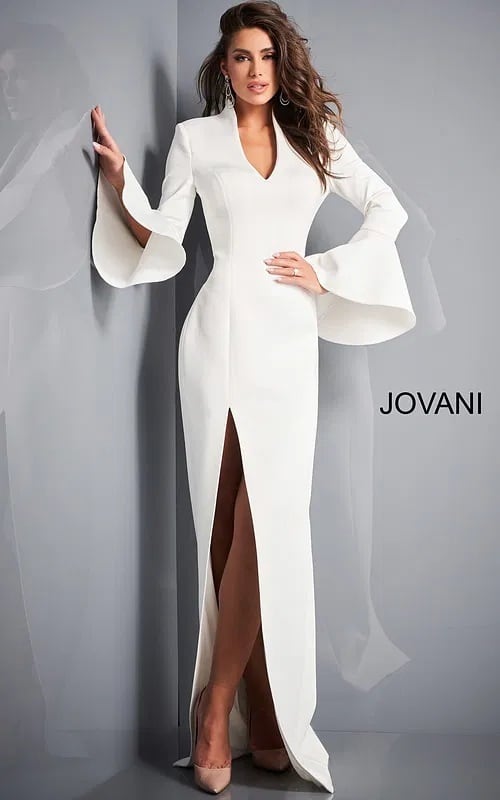 【JOVANI】Jovani 04240 White High Slit Bell Sleeve Gown